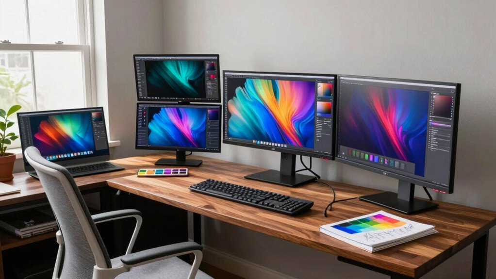 Choosing the right 4K monitor for graphic design hinges on color accuracy, which is essential for guaranteeing the colors you see on-screen closely match the final printed product. A monitor with a color accuracy rating of ΔE < 2 is ideal, as it assures reliable color reproduction, critical for precise editing. I also look for a wide color gamut—99% Adobe RGB or 99% DCI-P3—because it lets me view a broader range of colors, resulting in more vibrant visuals. Calibration matters too; factory-calibrated monitors typically perform better right out of the box. Finally, consistent color performance across viewing angles is fundamental. It guarantees that everyone on my team sees the same colors, which is key during collaborative projects.