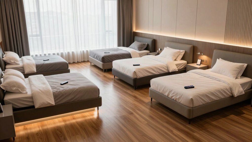 How do you make the most of your adjustable bed experience? The right remote control options can elevate your comfort considerably. I love that many adjustable bed bases come with wireless remotes, letting me adjust the head and foot positions without leaving the covers. Some remotes even offer preset positions like Zero Gravity and Anti-Snore, which make finding my ideal setting a breeze. Plus, ergonomic designs with backlighting are super handy for late-night adjustments. Advanced features like programmable memory settings let me save my favorite positions for quick access. If you’re sharing a split king bed, having multiple remotes means my partner and I can customize our sides independently, ensuring we both get a great night’s sleep.