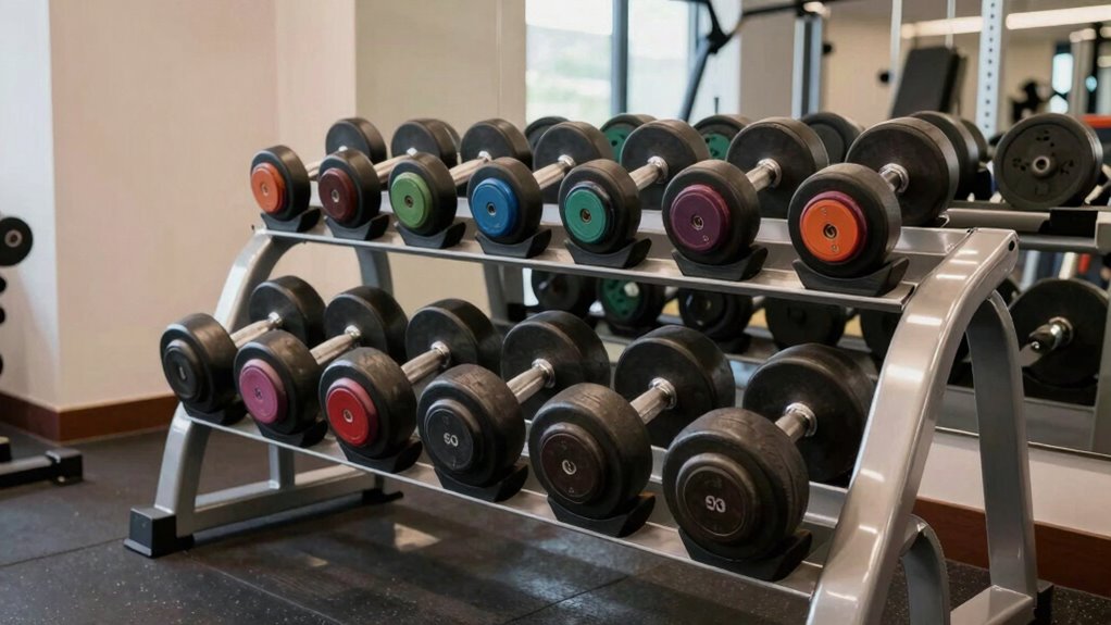 When I’m choosing an adjustable dumbbell set, I focus on a few key factors. The weight range flexibility, adjustment mechanism efficiency, and build quality are essential for my workouts. I also consider ergonomic design features and space-saving solutions to guarantee I get the most out of my investment.