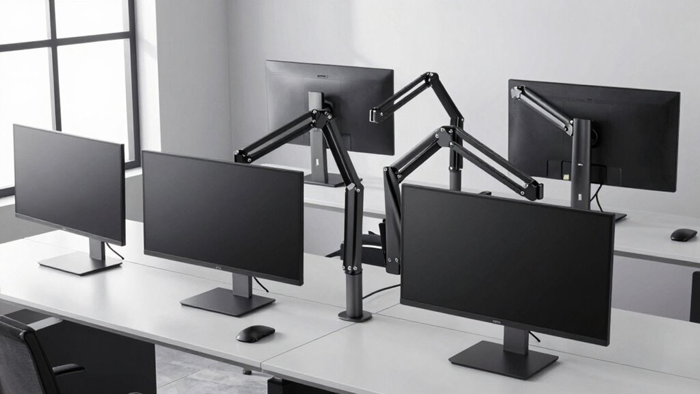 To install dual monitor arms, I typically need a few tools. You’ll want a screwdriver, usually Phillips-head, to secure the brackets. A wrench might come in handy for tightening bolts. I also grab a level to guarantee everything’s straight. Sometimes, a drill’s necessary if I’m mounting them on the wall. Finally, having a measuring tape helps me position the monitors just right. It’s all about getting that perfect setup!