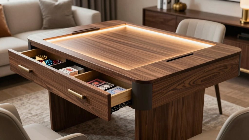 - Many tables incorporate built-in drawers, trays, and compartments for organized storage of game accessories and pieces.