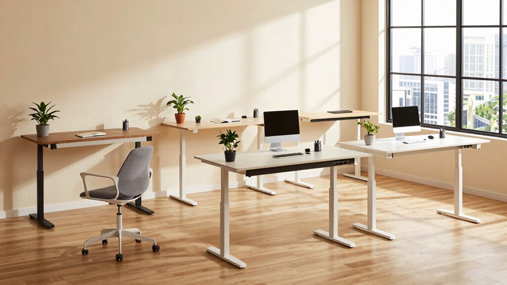 When I consider the ergonomic design of a standing desk, I know it’s essential for maintaining good posture and comfort during long work hours. An adjustable height mechanism, whether electric or manual, lets me effortlessly switch between sitting and standing, catering to my comfort. I appreciate features like tiltable tabletops, which allow me to work at various angles, making typing, drawing, or reading much easier. Memory presets for height adjustments are a game changer, letting me quickly return to my preferred positions without hassle. Ultimately, a well-designed ergonomic desk boosts my productivity and reduces fatigue, encouraging movement and promoting healthier work habits throughout the day. It’s an investment in my well-being and efficiency.